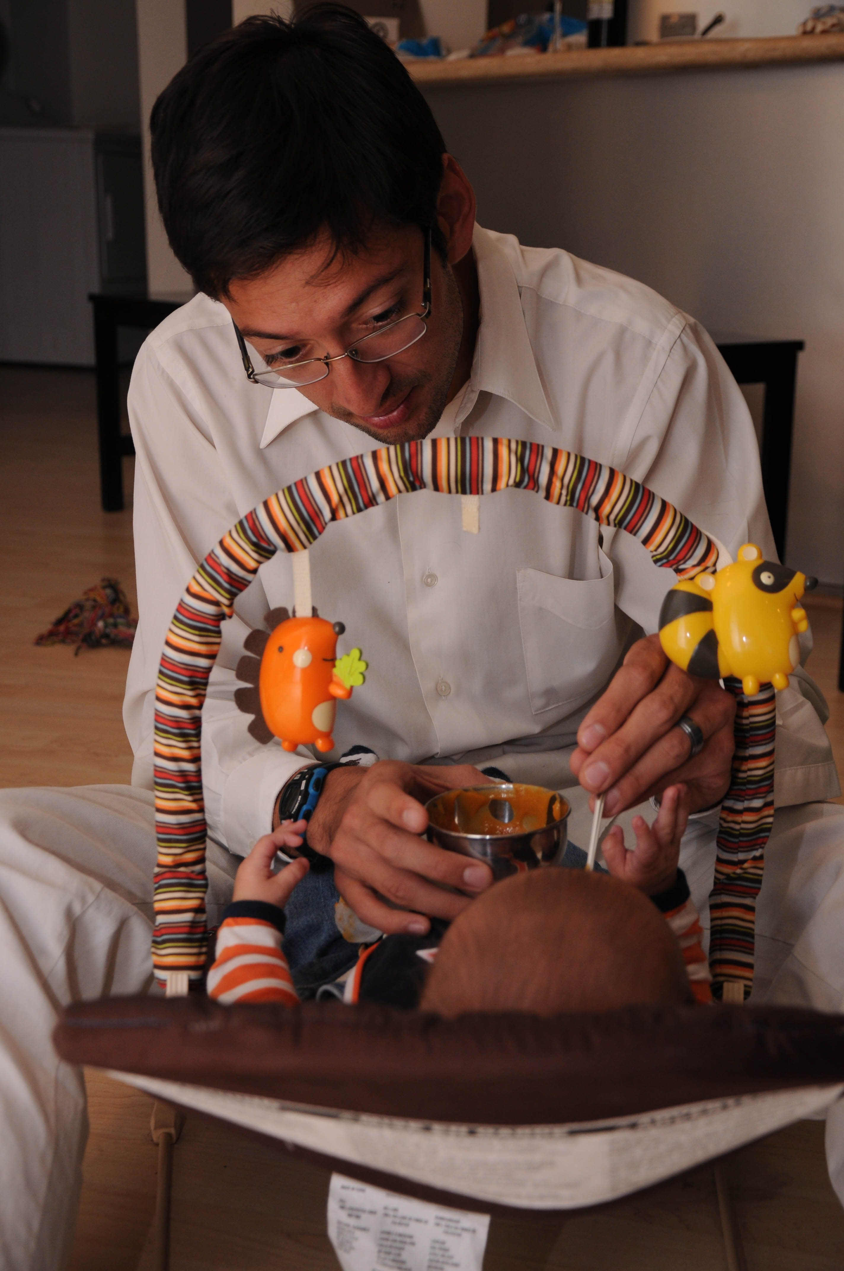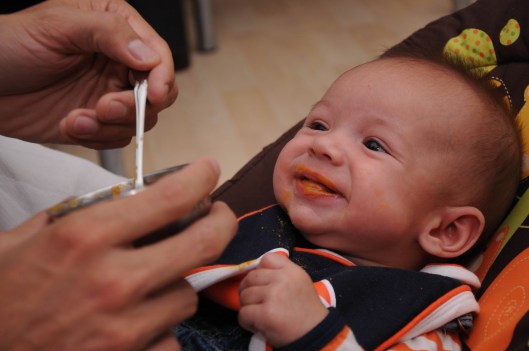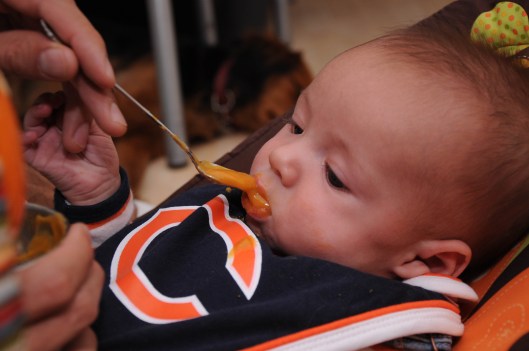 Dexter had his first food this week.  We started with sweet potatoes and he is a BIG fan!