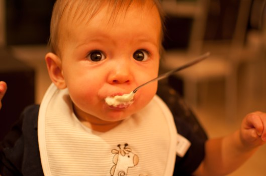 Dexter believes anything that lands in his mouth is his to keep … even the spoon that delivers the food. He’ll hold it like this until he gives me a little yell for not putting more food on the spoon.