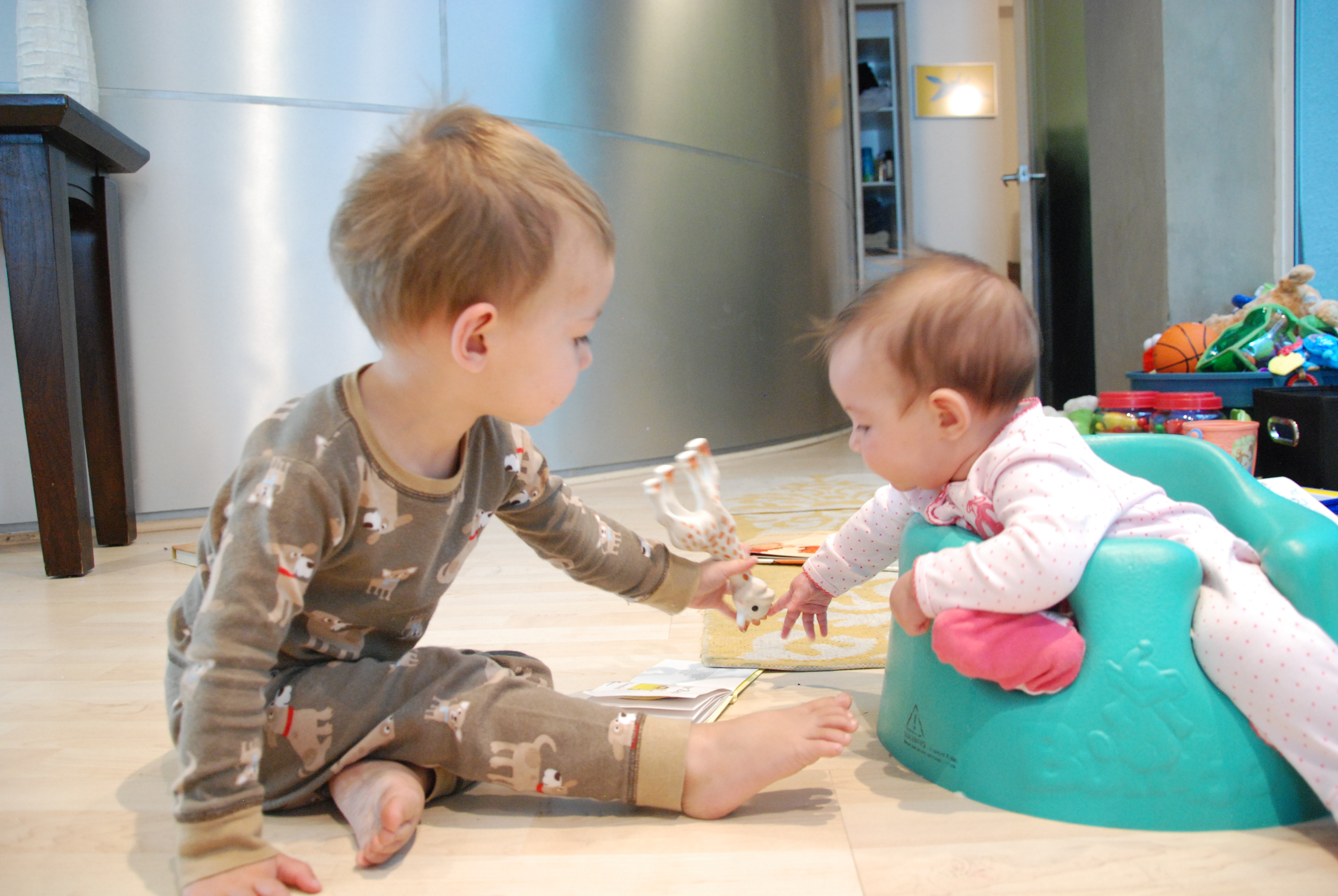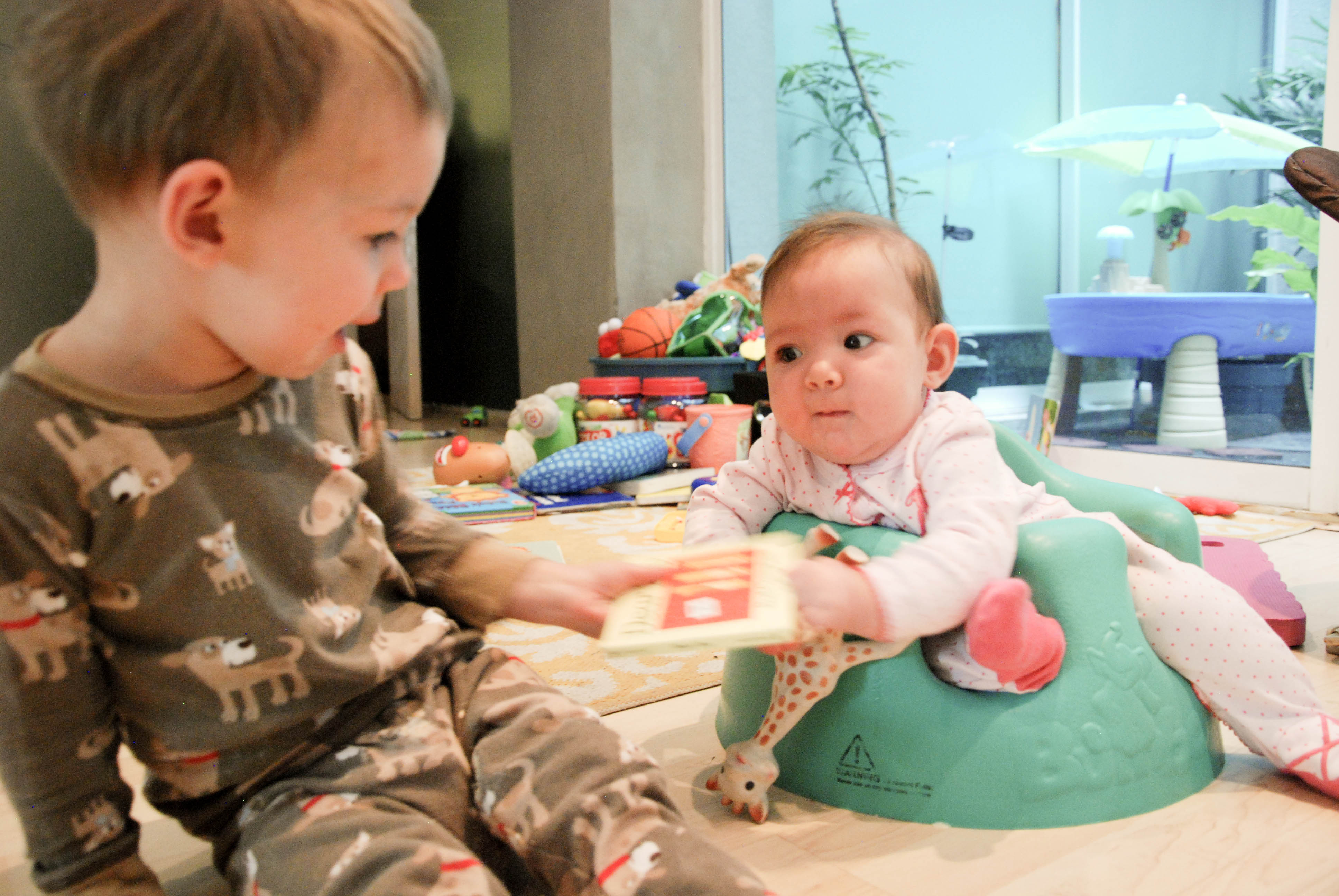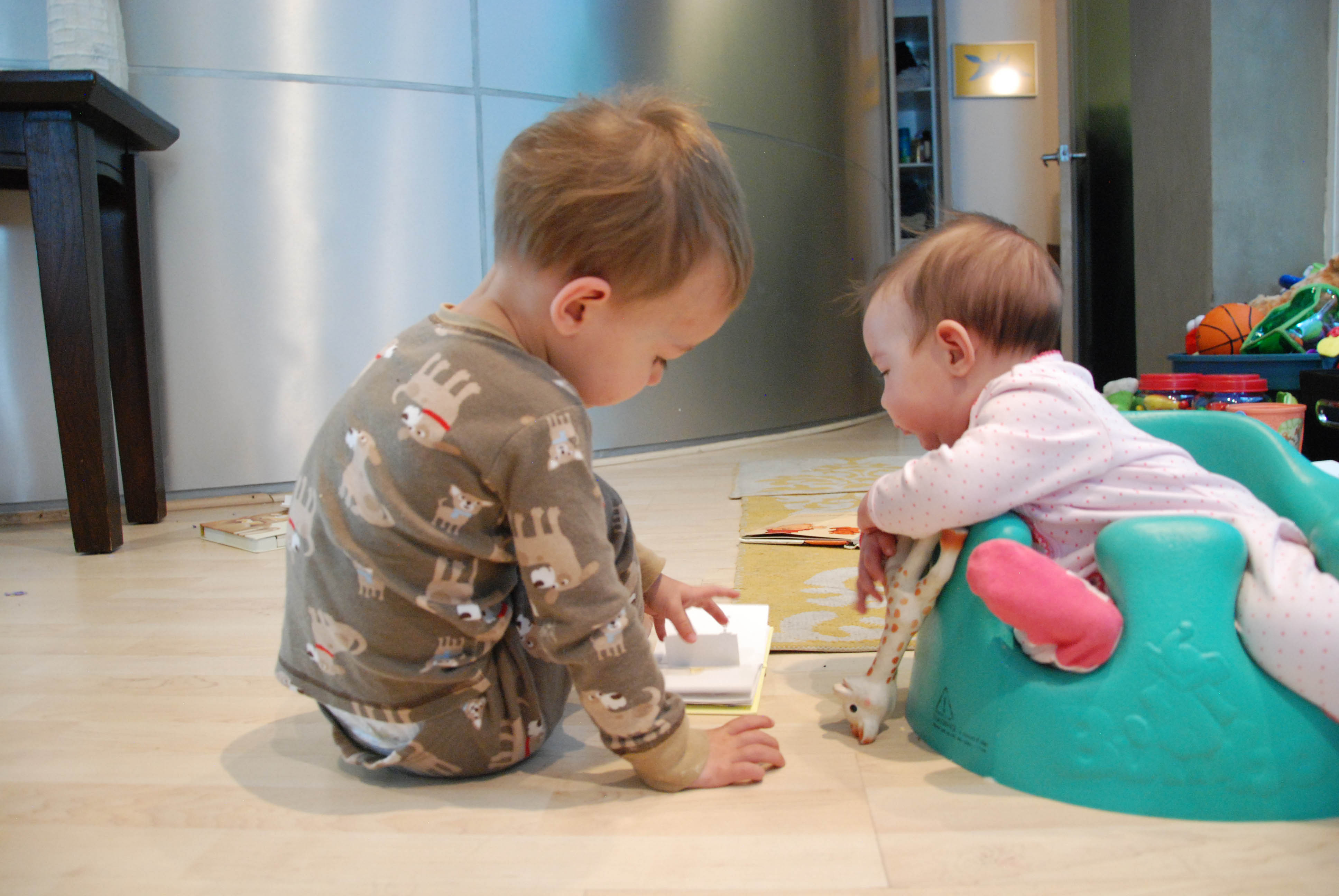 I know that these exchanges will be short-lived, especially because Alex is well on her way to becoming mobile. She hasn’t become intrusive in Dexter’s world, yet. All toys are still his. All books are still his. The high chair is still his. Etc. Etc. Etc.
