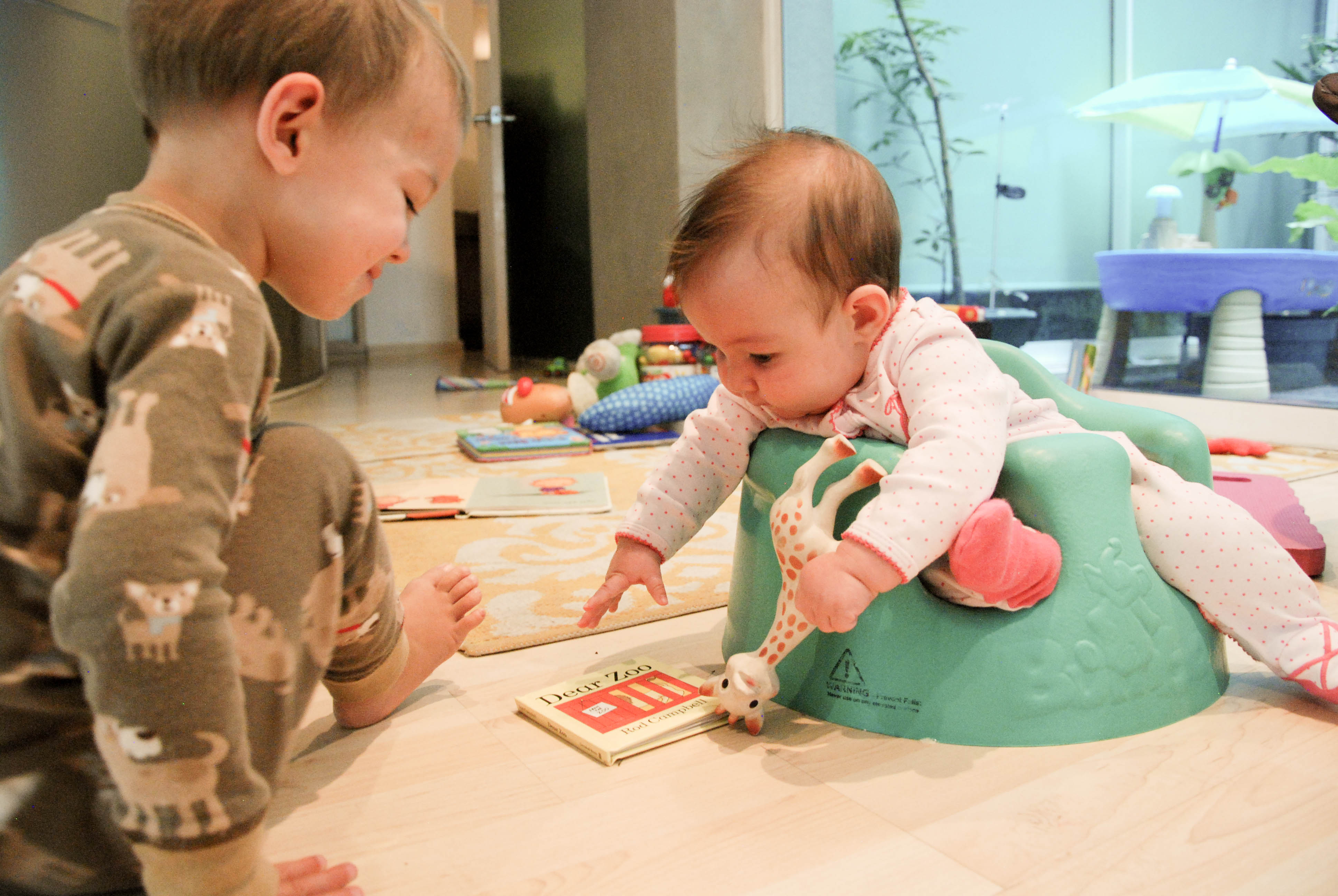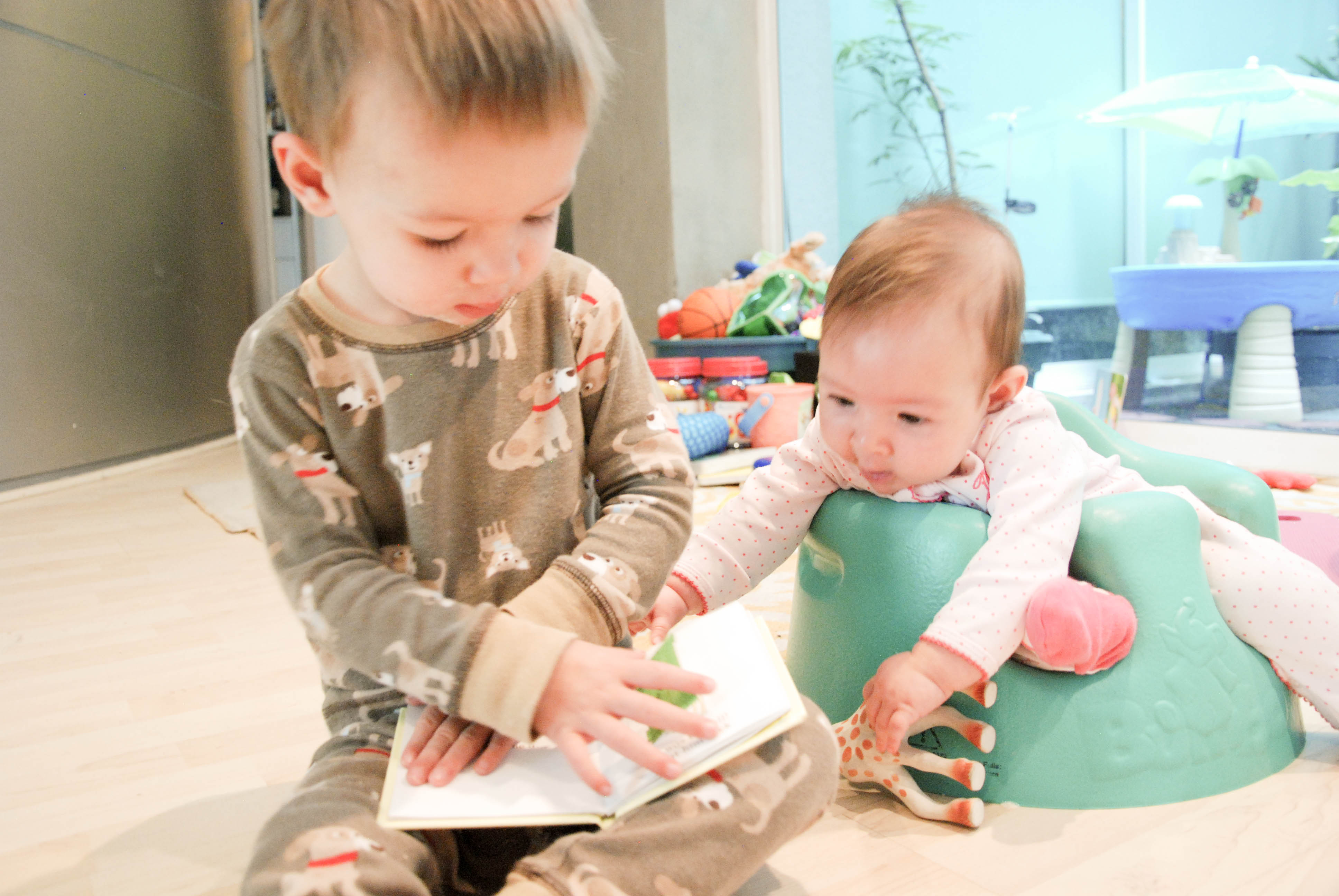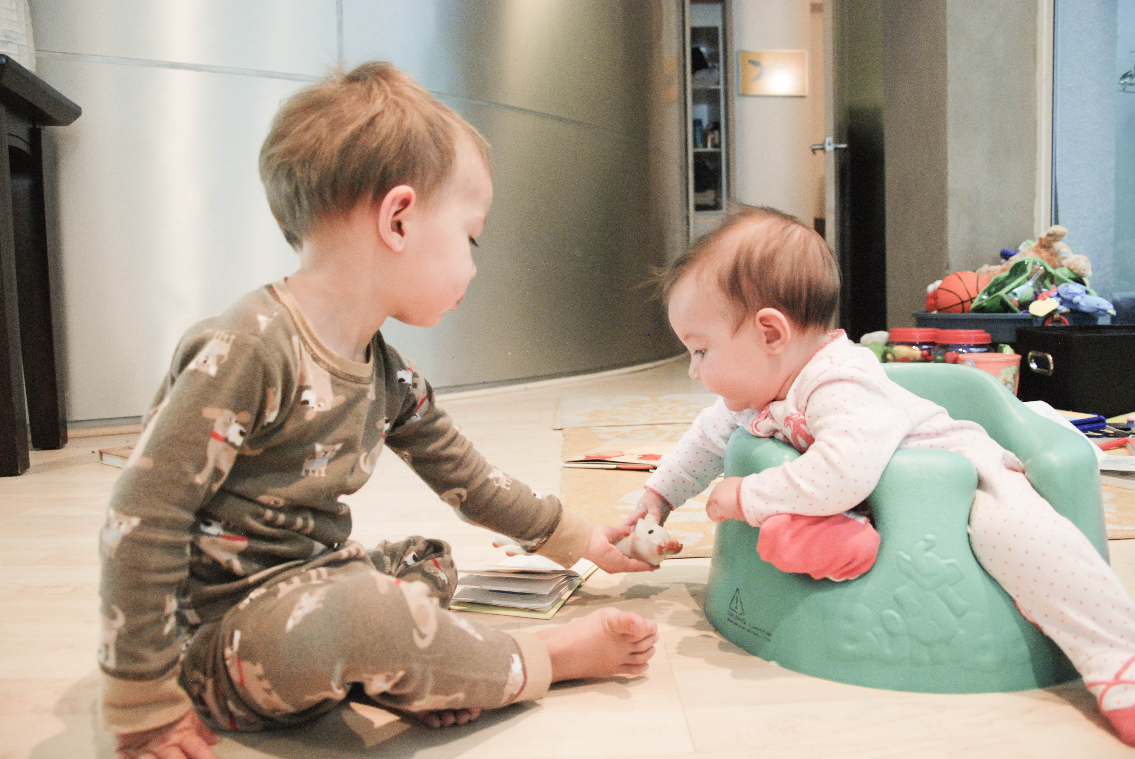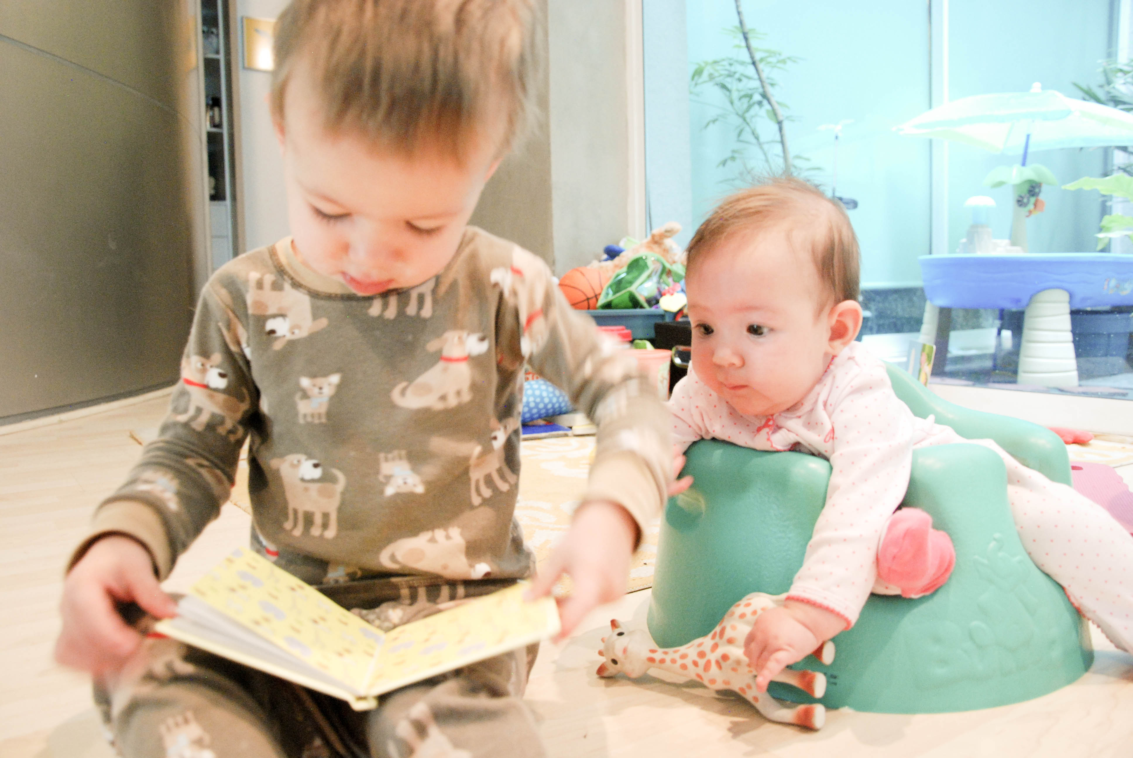 I know that these exchanges will be short-lived, especially because Alex is well on her way to becoming mobile. She hasn’t become intrusive in Dexter’s world, yet. All toys are still his. All books are still his. The high chair is still his. Etc. Etc. Etc.